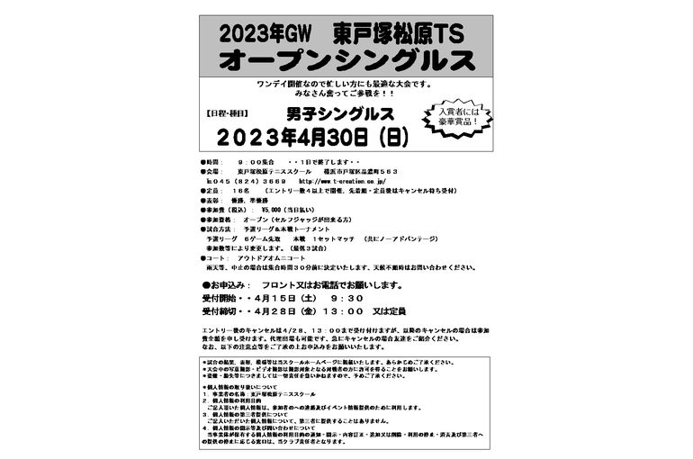 男子シングルスのオープン大会を4/30(日)東戸塚にて開催します!!